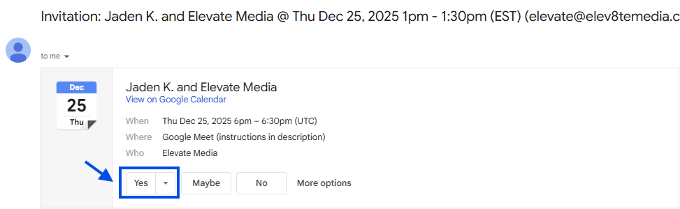 You’ll receive a calendar invite from Elevate Media in your inbox. Open the email and click “Yes” to confirm your attendance.